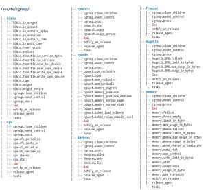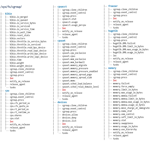 Pseudo FS do Cgroups. Em vermelho, a implementação dos LXC.