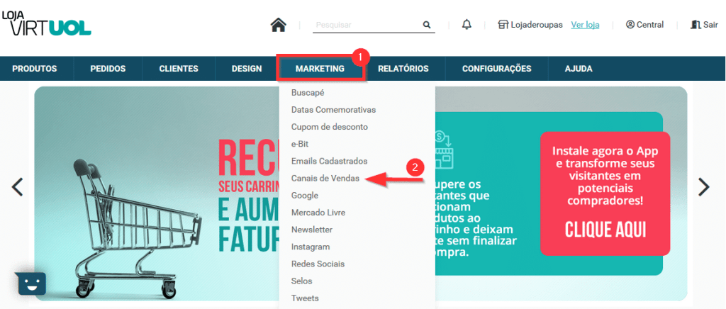 Na sequência, acesse o painel da sua Loja VirtUOL, clique no menu “Marketing” e depois vá até a opção “Canais de Vendas”: