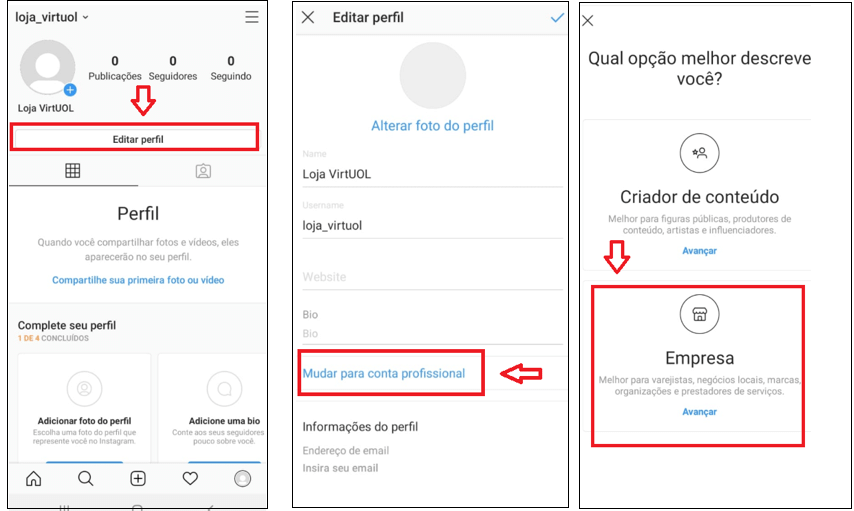 - Se o perfil da sua loja no Instagram não for comercial, acesse a rede social, clique em “Editar perfil” e “Mudar para conta profissional” (conforme imagem abaixo):