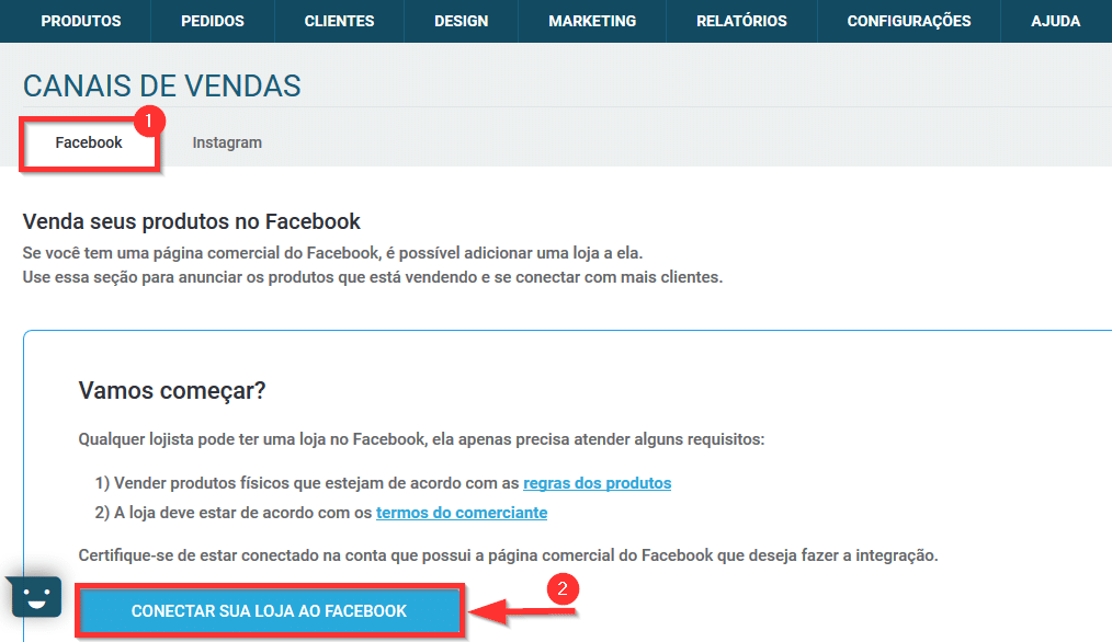 Entrou na página “Canais de Vendas”? Agora é só clicar na aba “Facebook” e no botão “Conectar sua loja ao Facebook”: