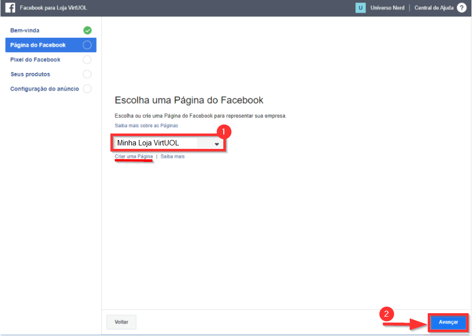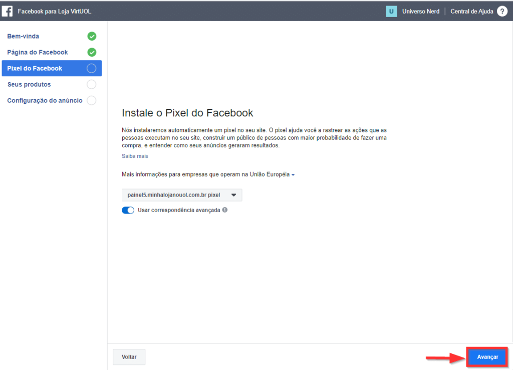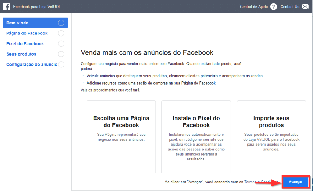 Nesta etapa, faça o login no seu perfil do Facebook. Na sequência, você será redirecionado até a página “Facebook para Loja VirtUOL”. Basta clicar no botão “Avançar”: