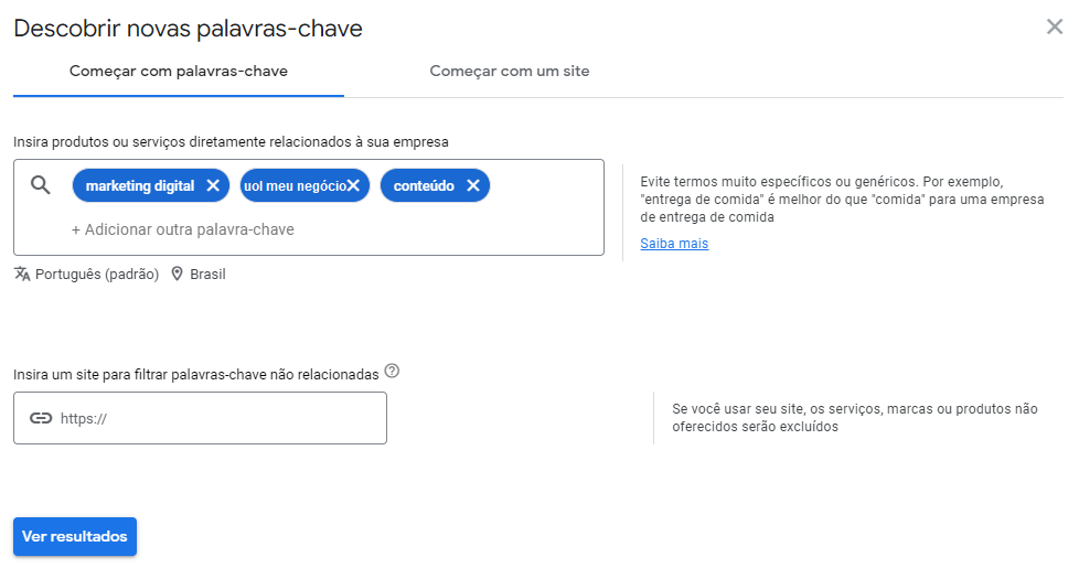 - Idioma: para obter palavras-chave relevantes em um idioma específico.