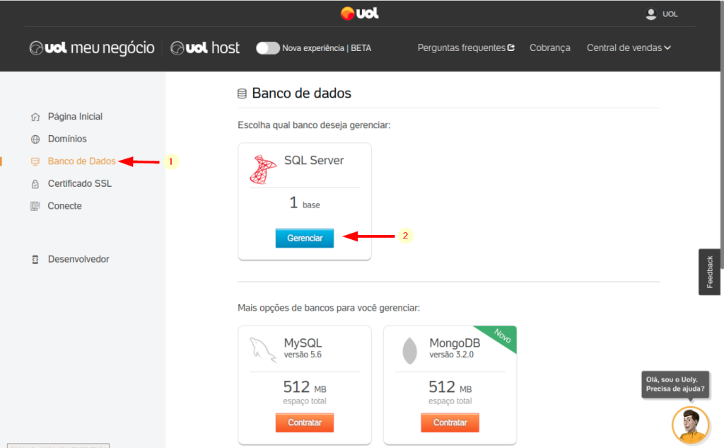 No Painel do Cliente, selecione o produto “Banco de Dados” no menu lateral esquerdo. Em SQL Server aperte o botão “Gerenciar”:
